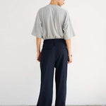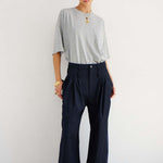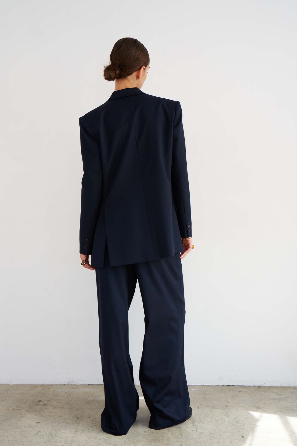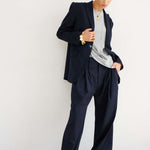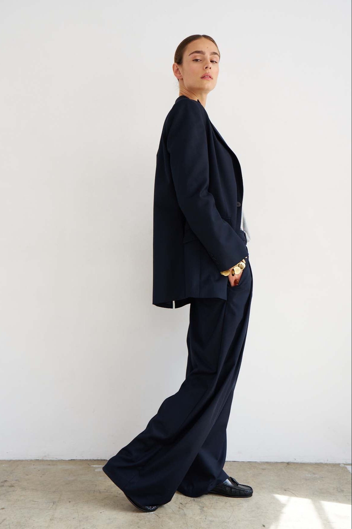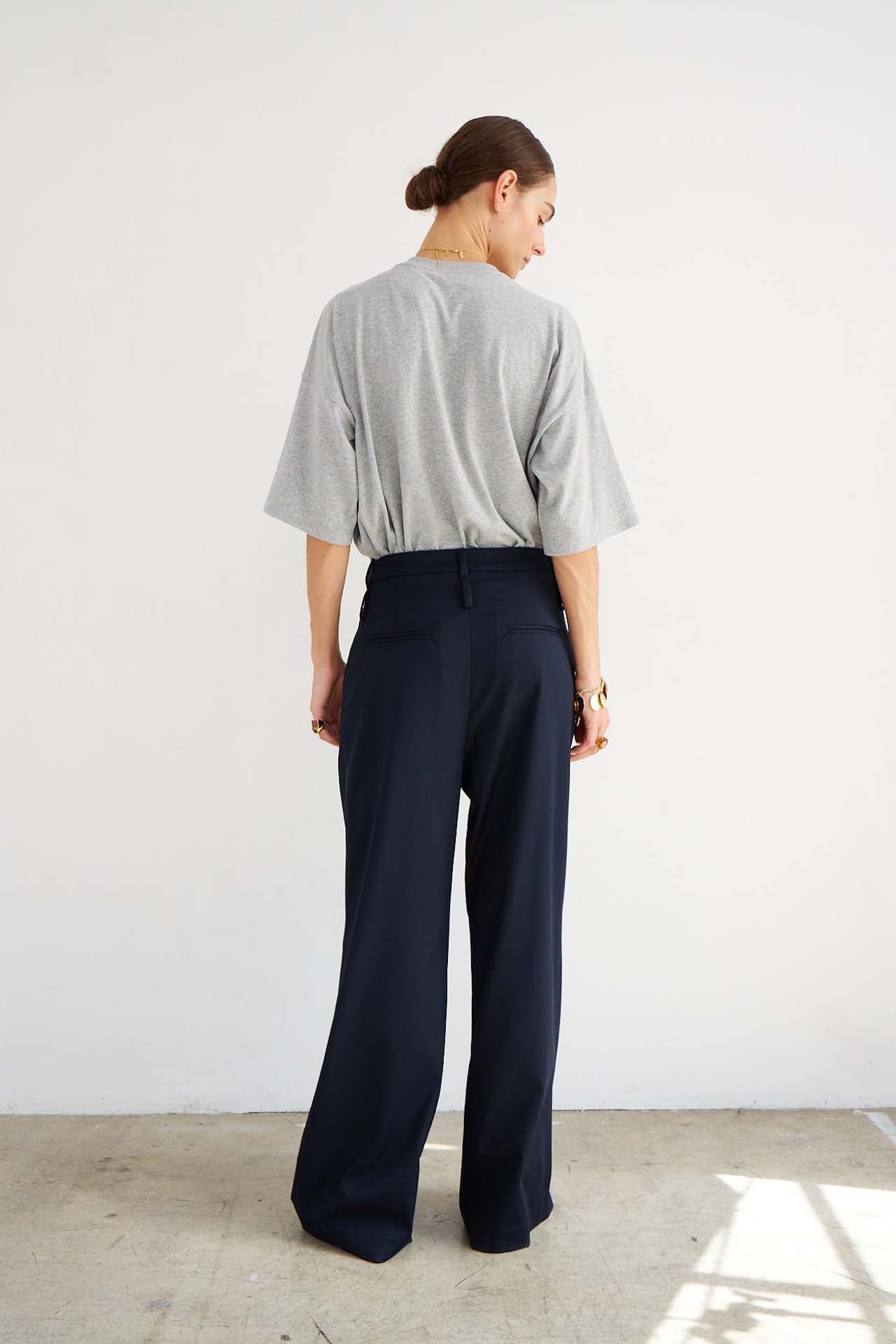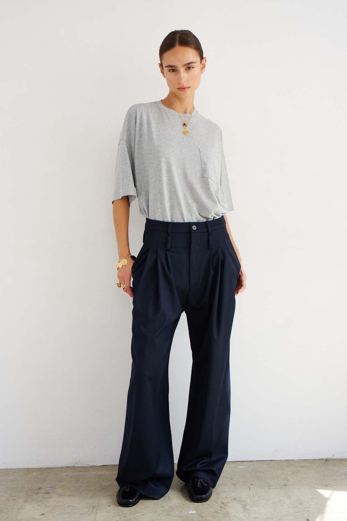 A mid rise trouser with triple pleat detailing at hip level offers beautiful drape and fullness in a low and extremely flattering position. Tailored in Los Angeles in European gabardine.