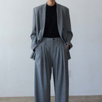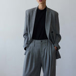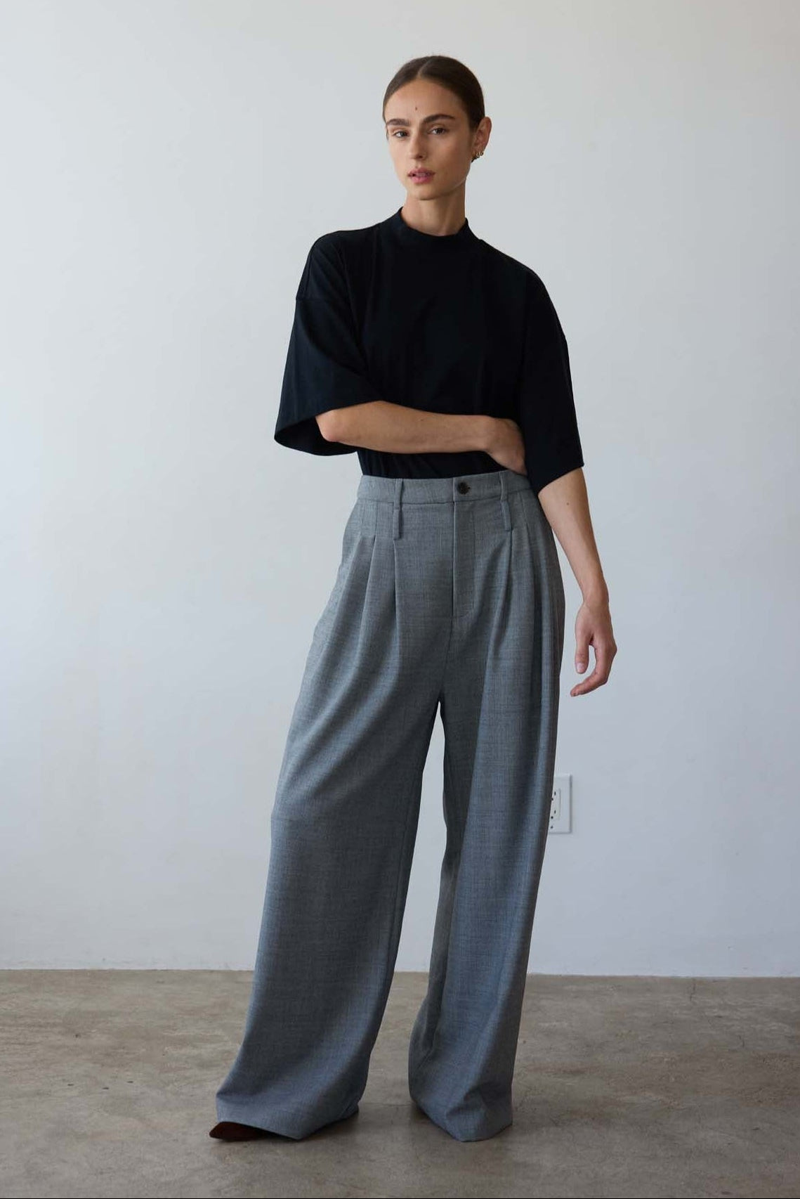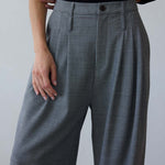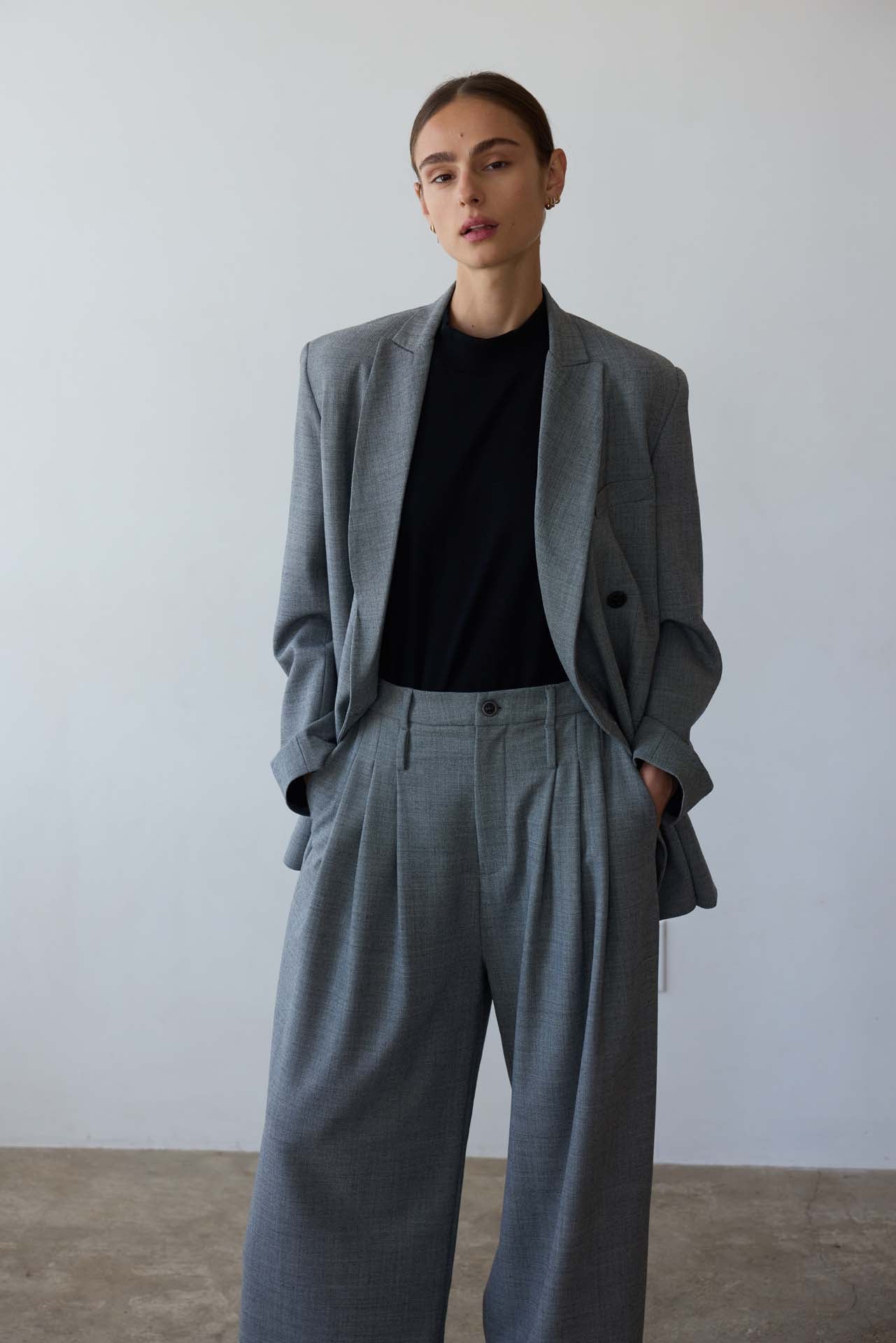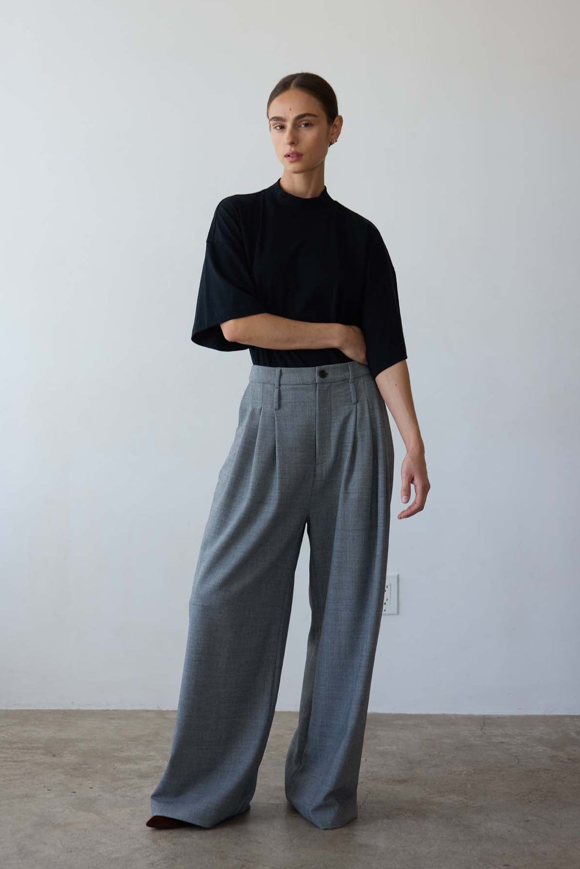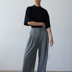 A mid rise trouser with triple pleat detailing at hip level offers beautiful drape and fullness in a low and extremely flattering position. Tailored in a soft and drapy Italian suiting. A virgin wool blend with a salt and pepper effect.