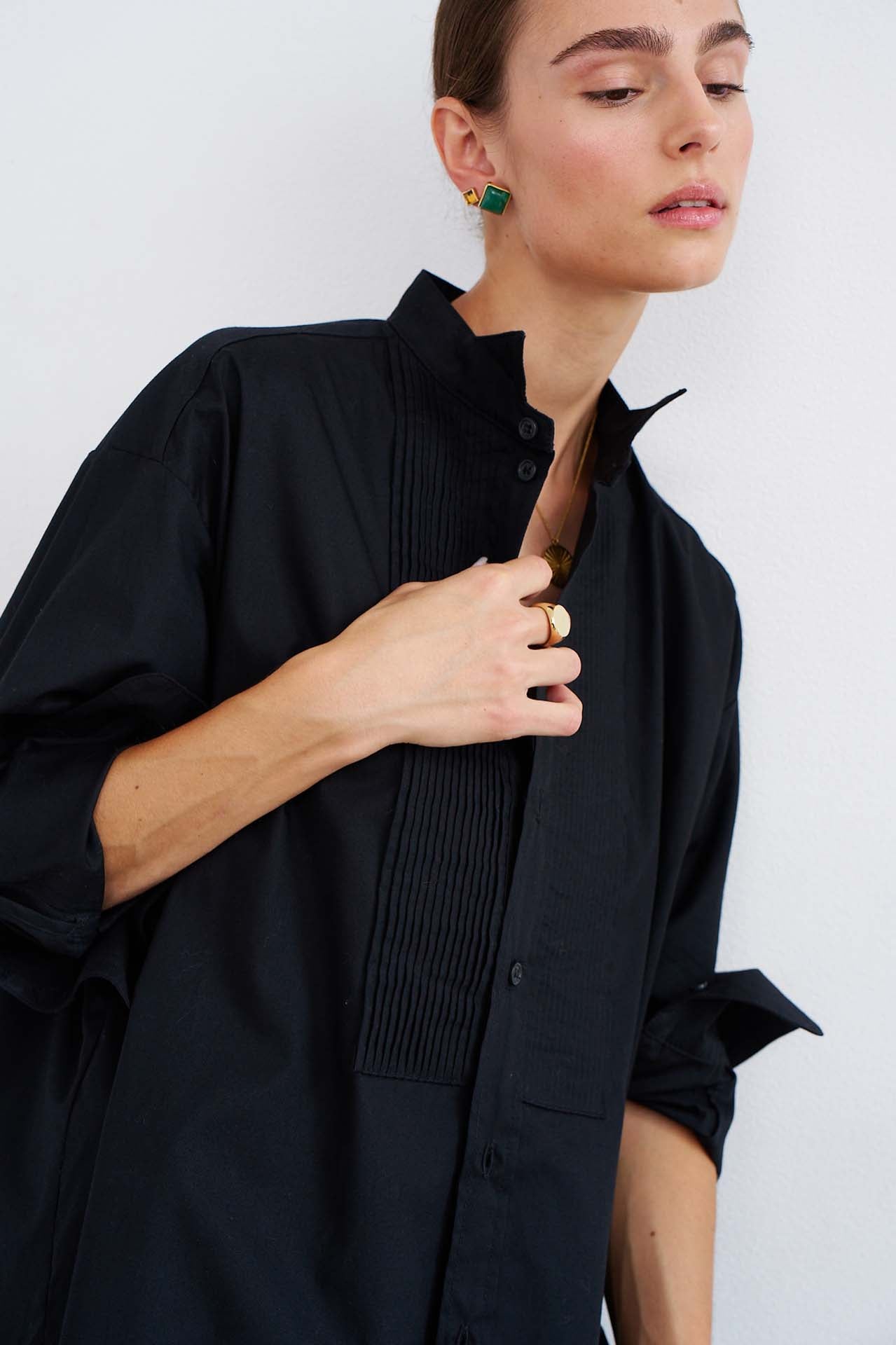 Inspired by a traditional mens tuxedo shirt.  Rooted in black tie with a west coast perspective.  A cult classic. Tailored in Los Angeles using Japanese piece dyed poplin. 100% cotton.