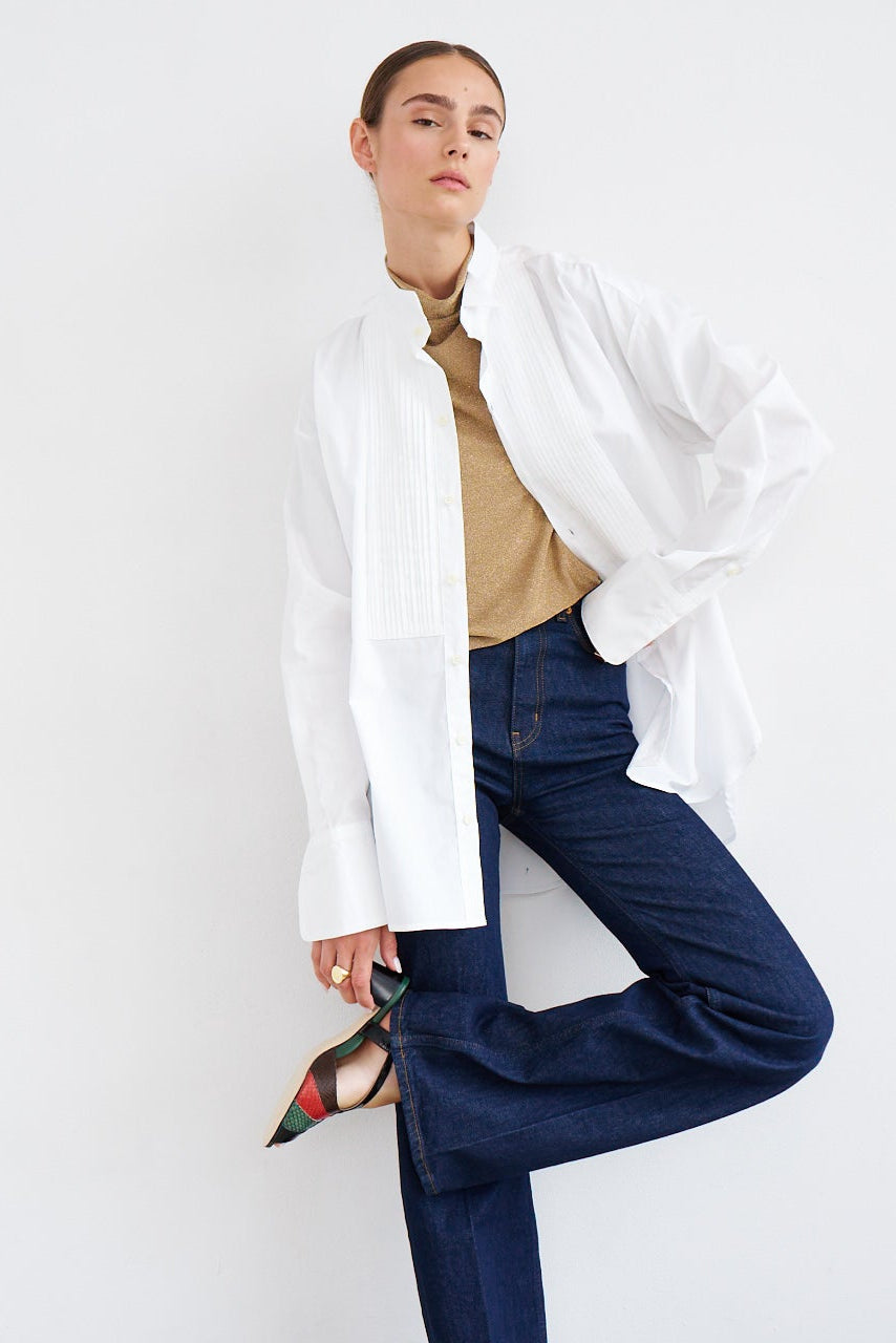Inspired by a traditional mens tuxedo shirt.  Rooted in black tie with a west coast perspective.  A cult classic. Tailored in Los Angeles using Japanese piece dyed poplin. 100% cotton.