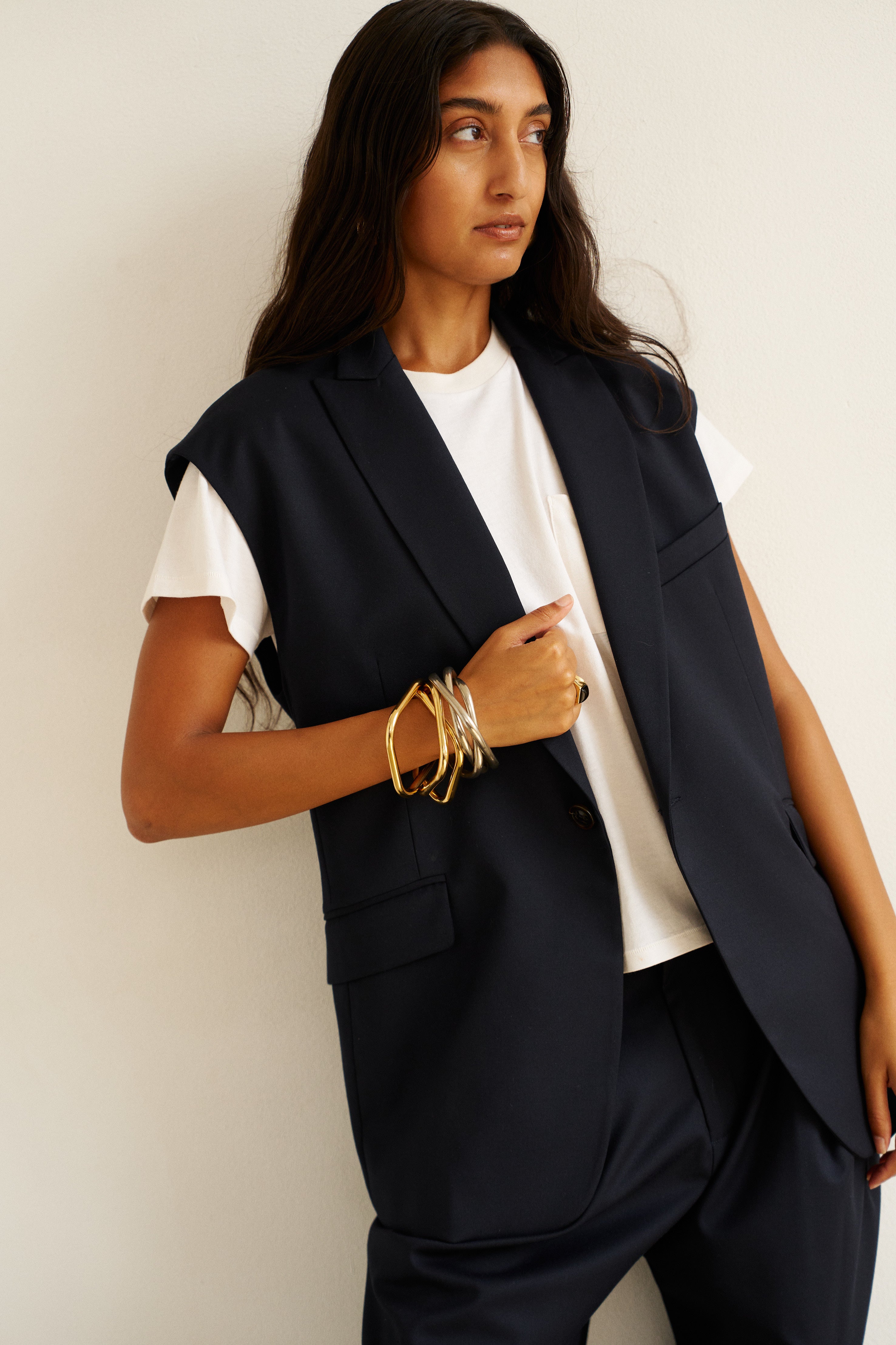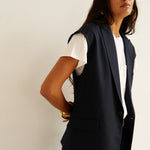 A modern and relaxed vest, classically tailored like a blazer. Fully lined with back vent and single button detail. Tailored in a tropical weight, virgin wool blend from Europe.