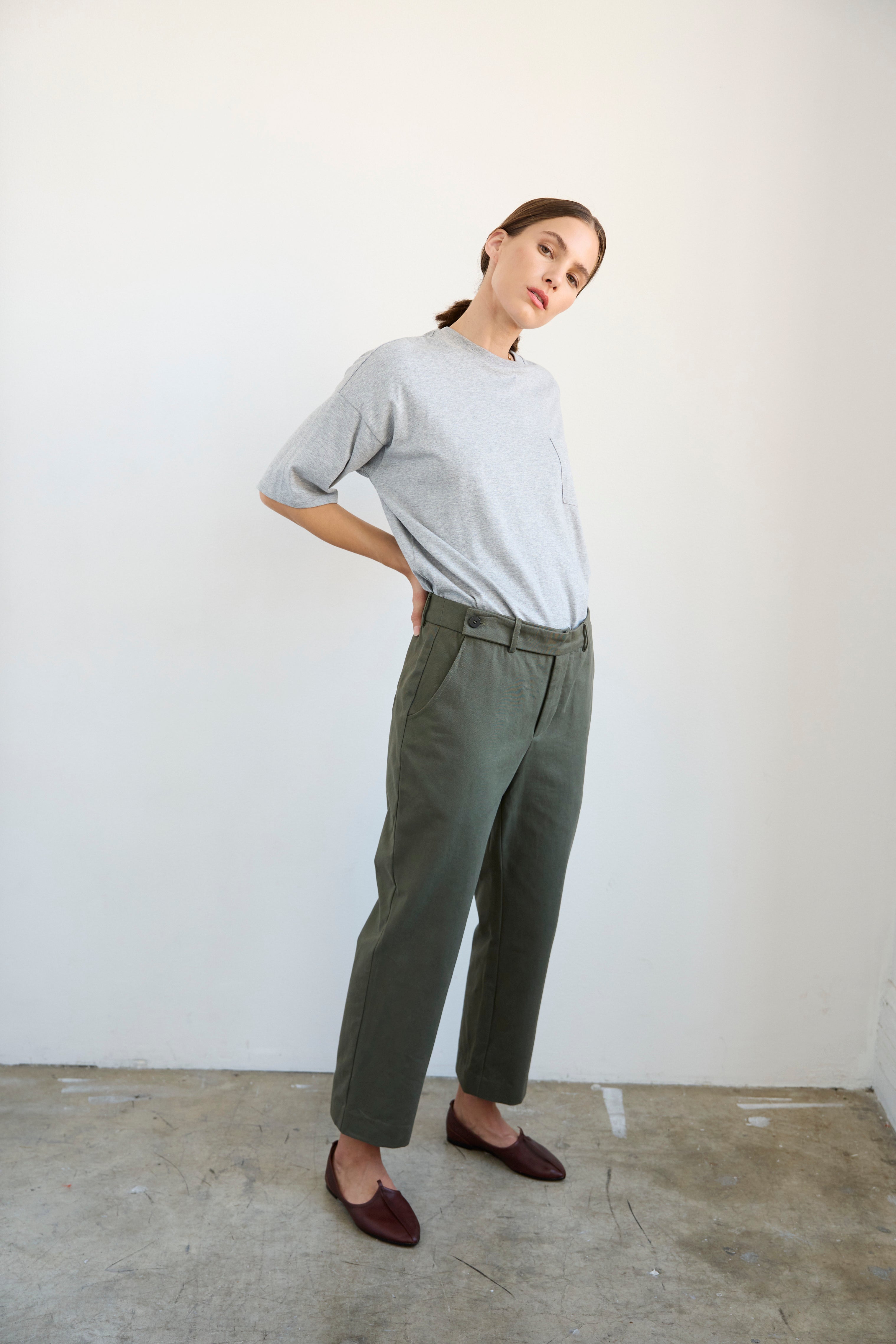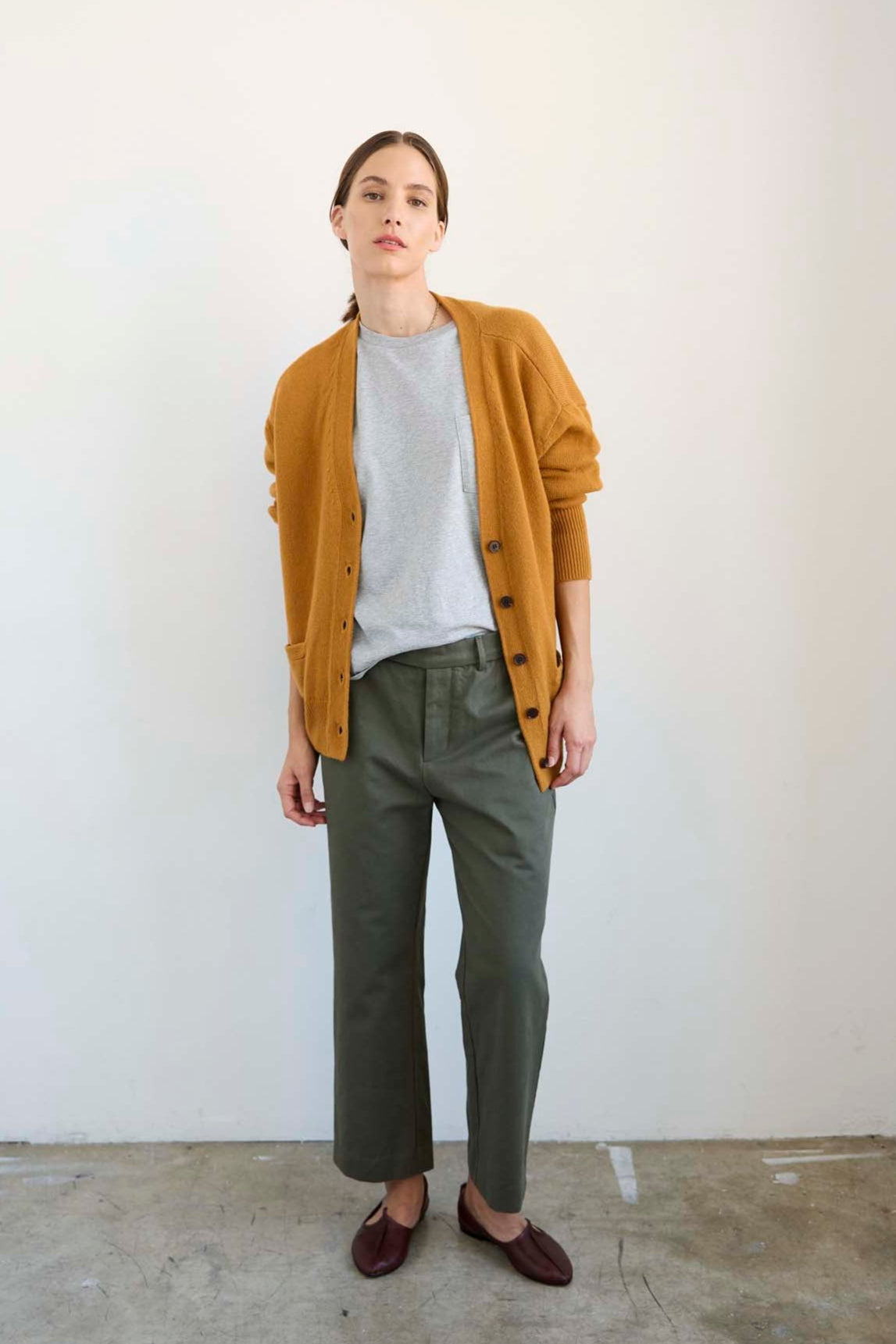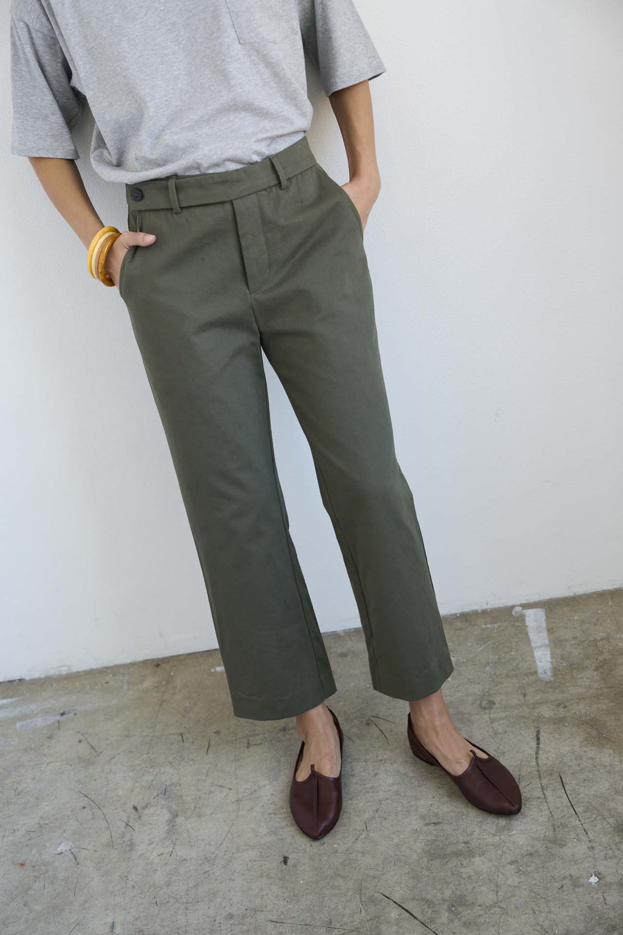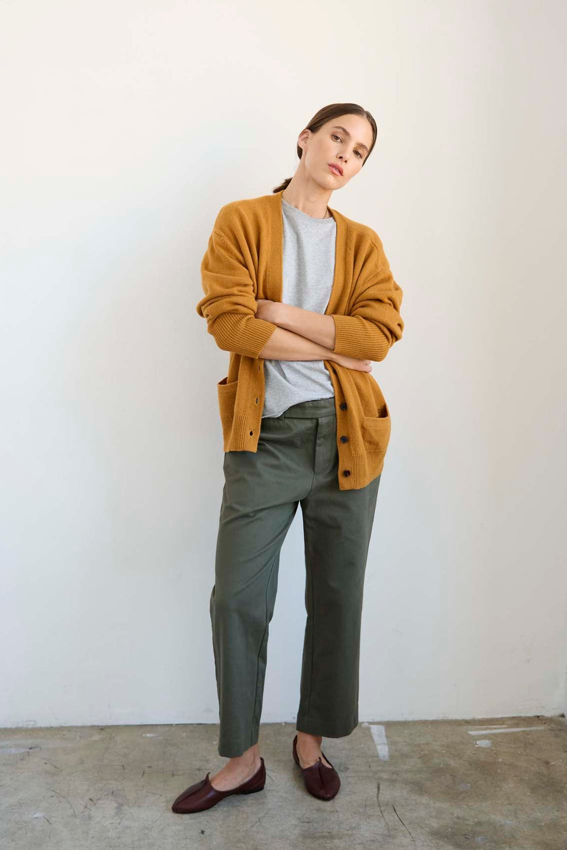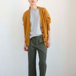 A beautiful pant is beautiful inside and out. The shape of the button extension, the soft liner behind the fly, the custom waist tape that fills you with satisfaction right before you put them on. The luxurious blind hem & beautiful Corozo buttons. The detailing is the focus. Understated and chill, not dressy, a true casual pant in piece dyed Japanese Brushed twill.