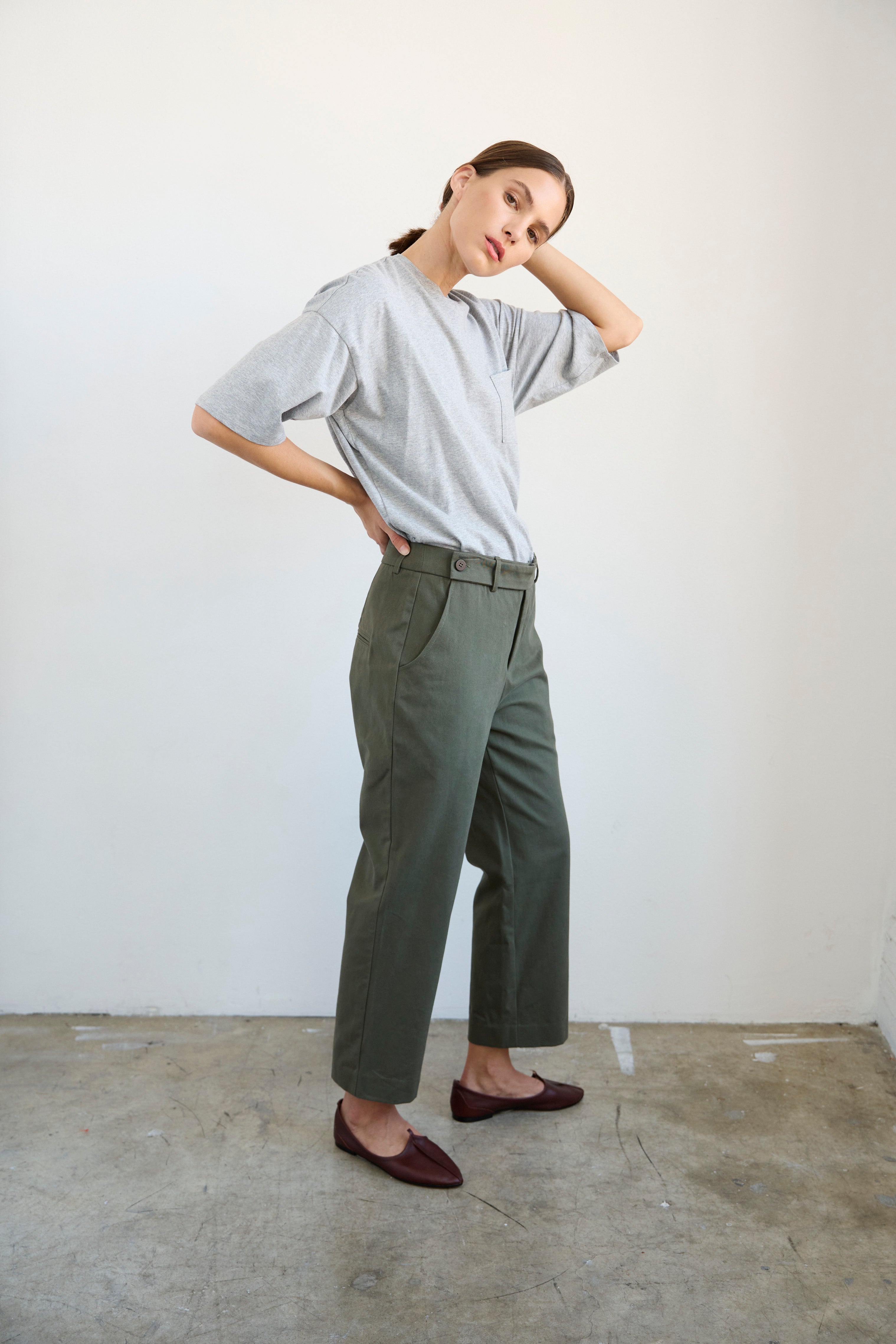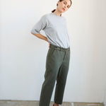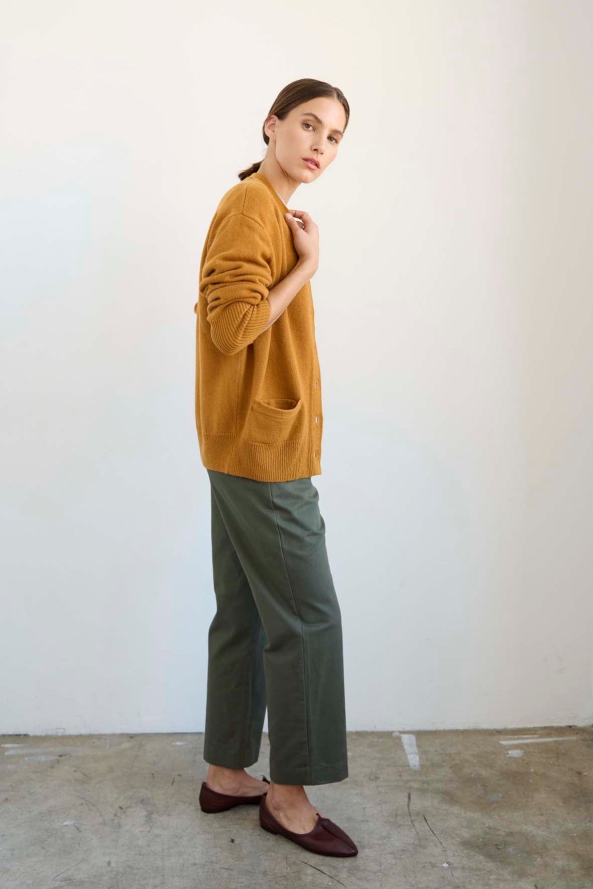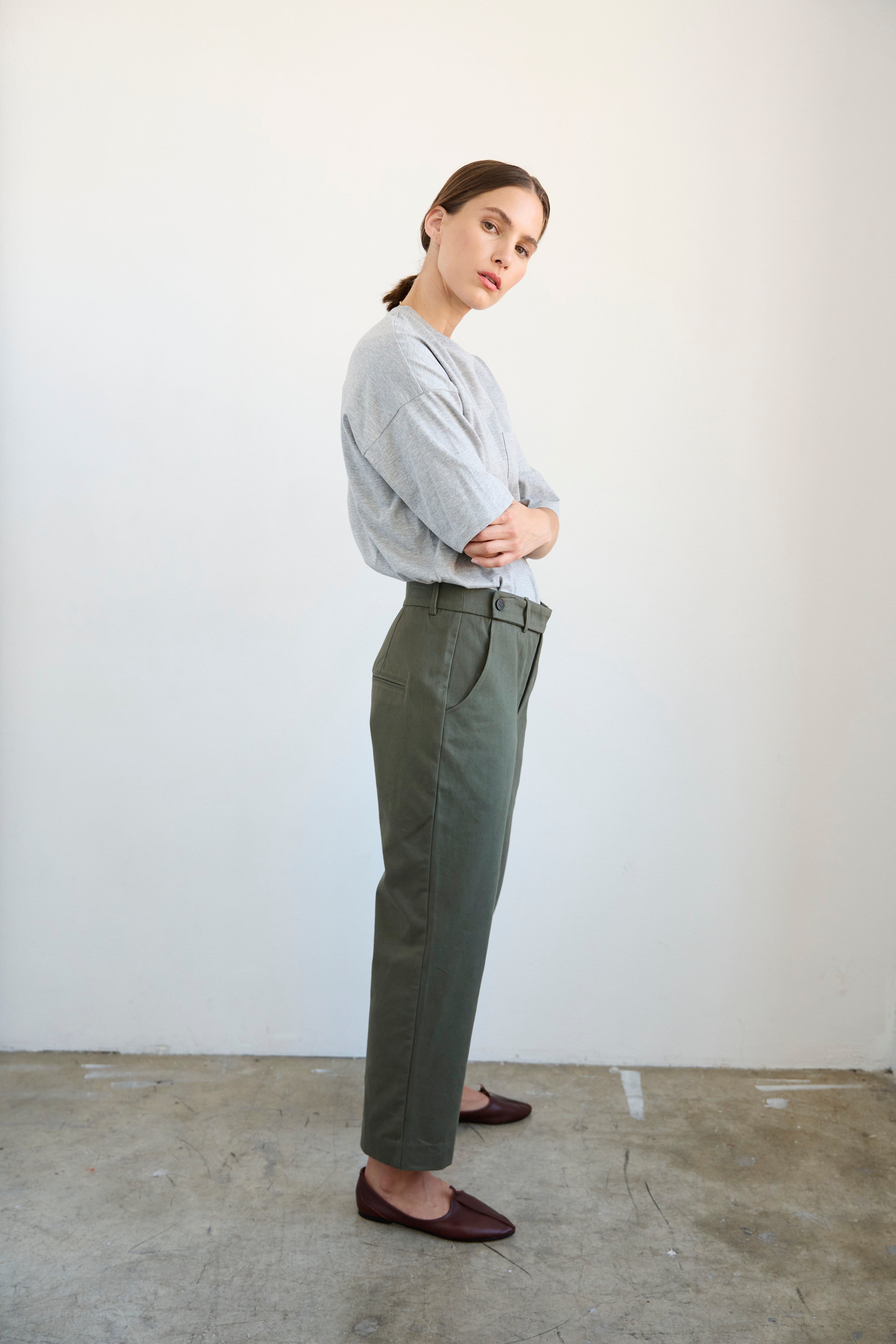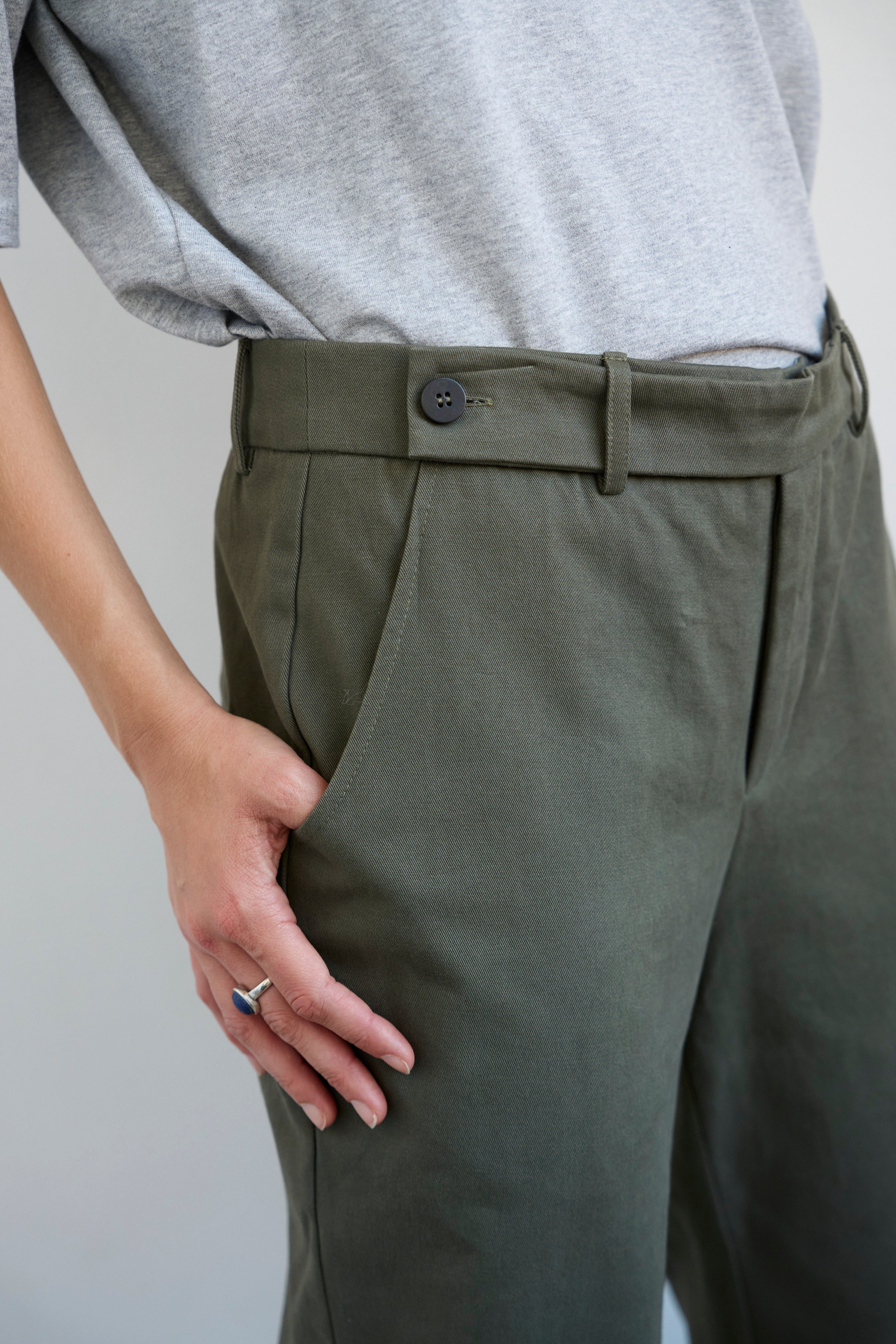 A beautiful pant is beautiful inside and out. The shape of the button extension, the soft liner behind the fly, the custom waist tape that fills you with satisfaction right before you put them on. The luxurious blind hem & beautiful Corozo buttons. The detailing is the focus. Understated and chill, not dressy, a true casual pant in piece dyed Japanese Brushed twill.